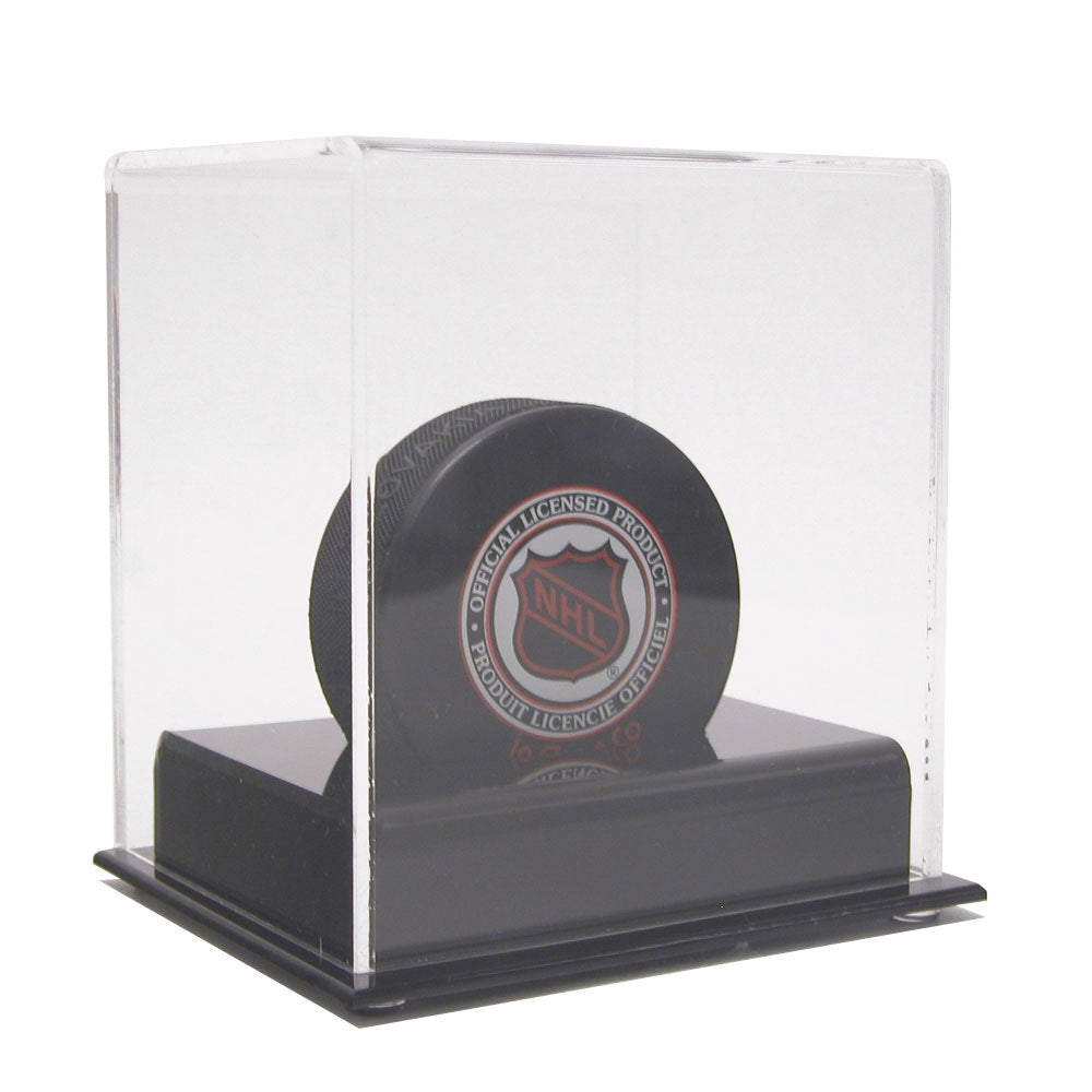 The Hockey Puck Display Case Acrylic Base features a raised black acrylic base with a clear cover all around for maximum protection and simple design to help maintain your hockey pucks value while enjoying having it displayed.
