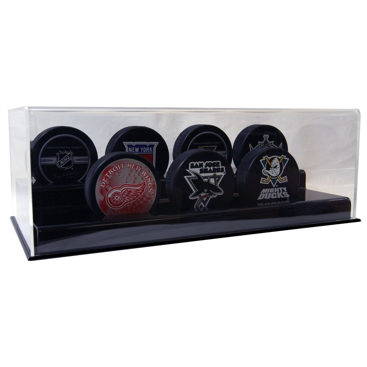 The Seven Hockey Puck Display Case Acrylic Base features a stadium style raised black base with a UV protected acrylic clear cover.