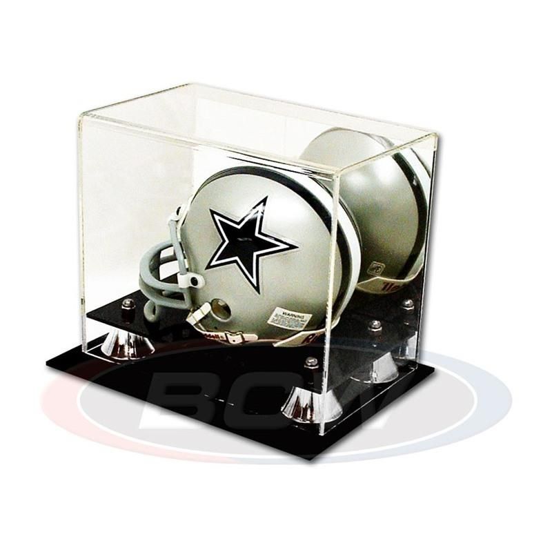 The Mini Football Helmet Premium Display Case with Silver Risers is the smaller version of our mighty popular helmet display case. It features a layered high gloss acrylic black base with silver risers and UV protected clear cover with a mirrored back. Use this sports memorabilia holder to protect, store and display your collectible mini helmets from companies like Schutt, Riddell and others.